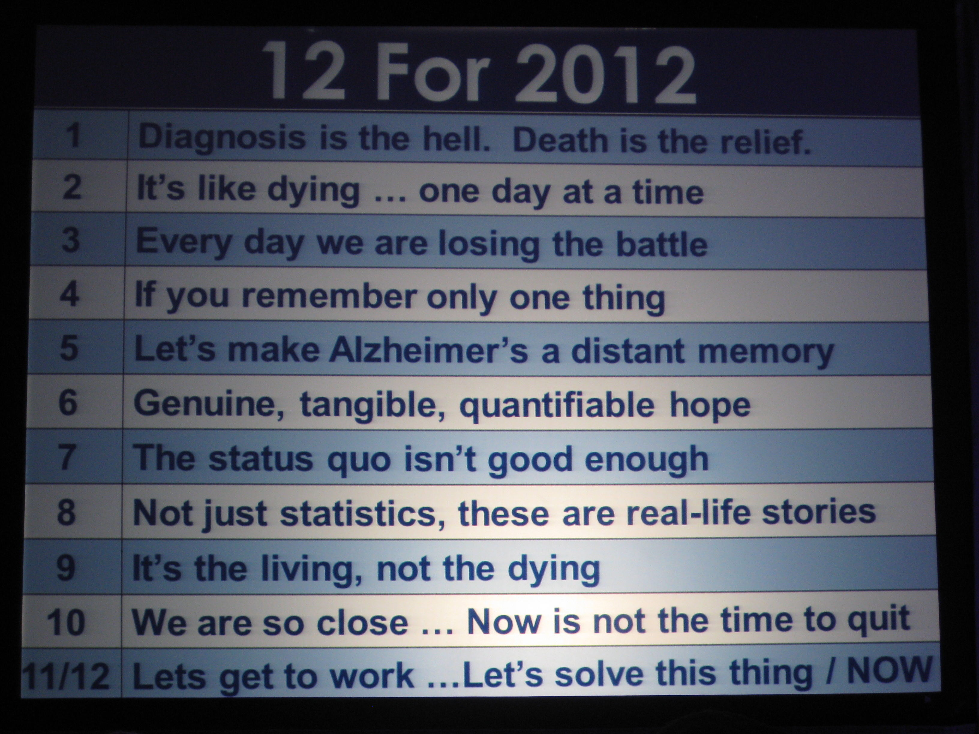 “When Amyloid therapies come online we won’t be done. There will be more to do but we’ll be closer to the end,” he said. And what determines the rate at which we get new treatments? The bottom line is research funding, which is part of why we are all in the room today.