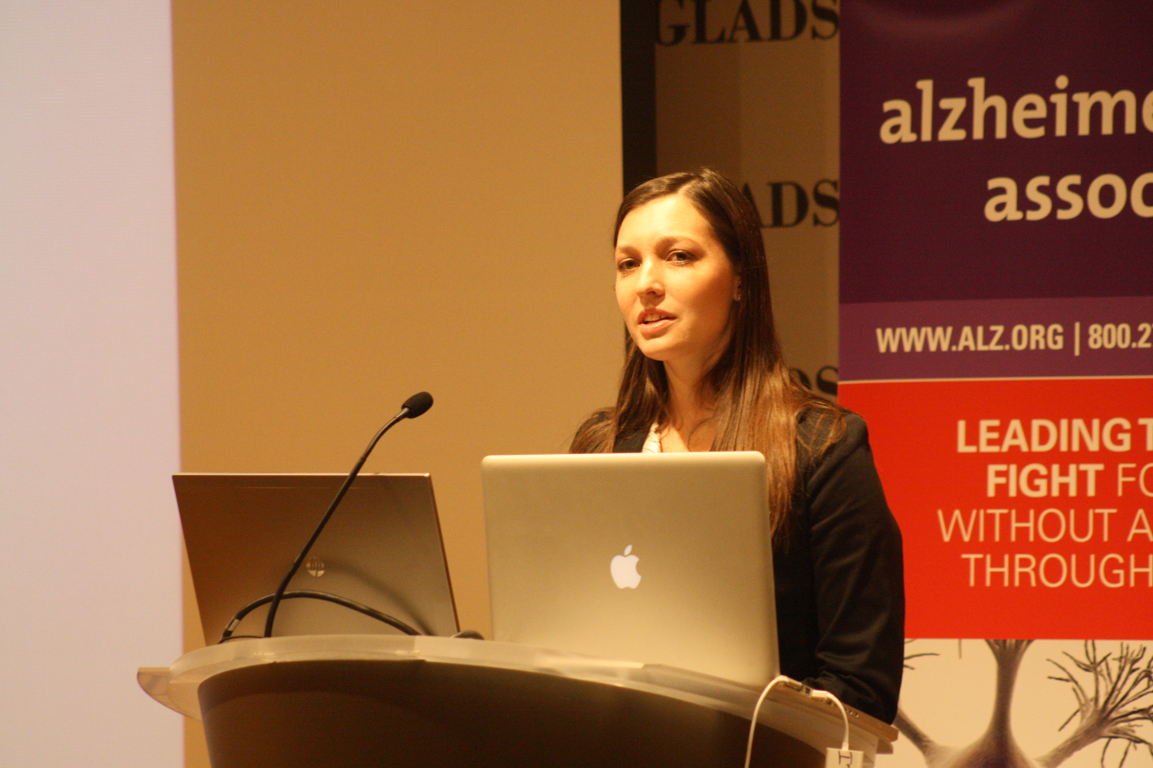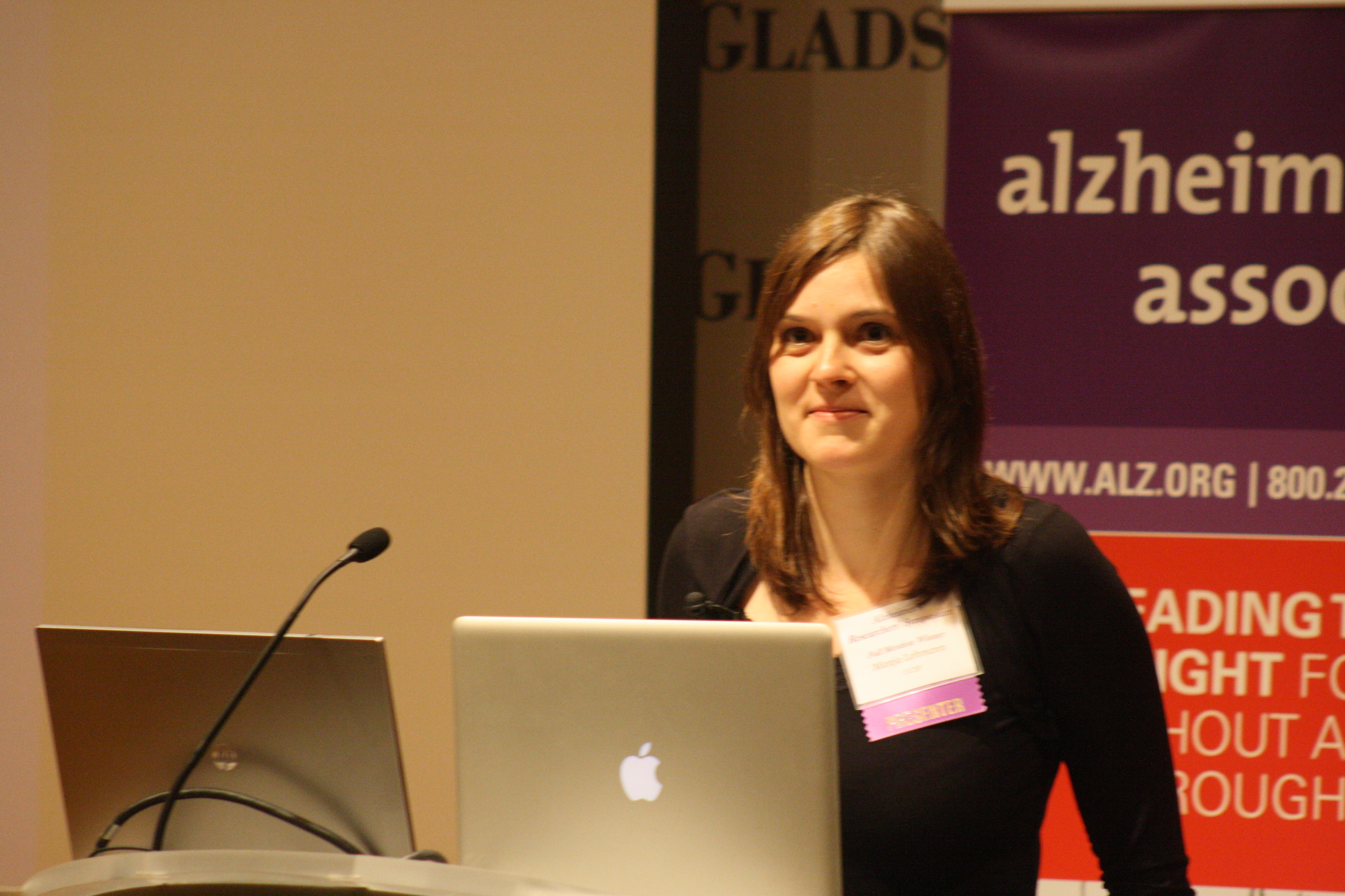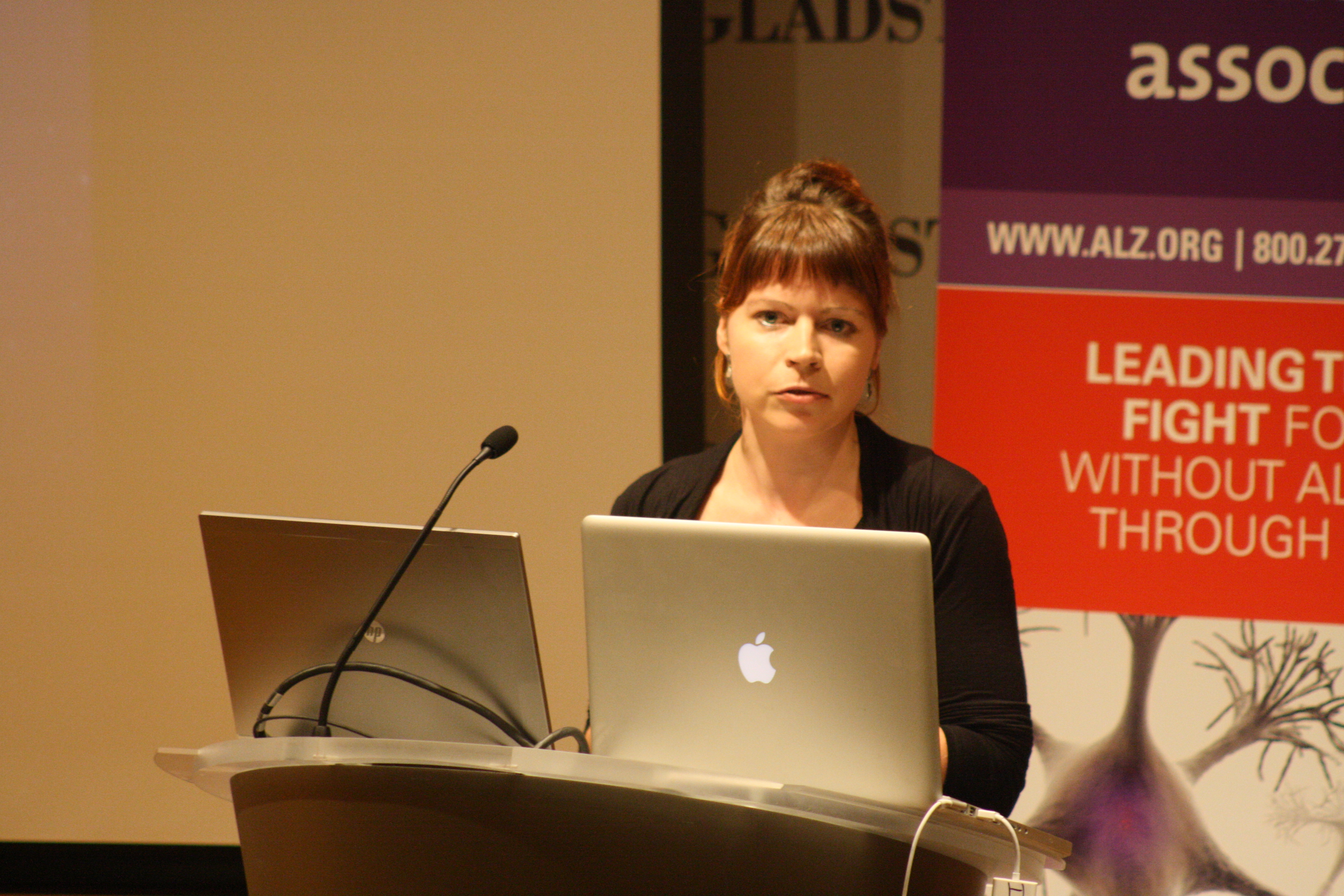 Next was a presentation from Dr. Michelle James who talked about some preliminary data out of her lab on molecular imaging. Molecular imaging could lead to early detection of Alzheimer’s disease and a greater understand of disease mechanisms. We know Alzheimer’s starts before symptoms are evident – which means it’s difficult to treat the disease because there’s already a lot of degeneration once the disease is finally identified. The existing biomarkers for Alzheimer’s have limitations so we need more. Dr. James talked about what an ideal Alzheimer’s biomarker would look like: it would help with early detection; it would be sensitive to and accurate in identifying Alzheimer’s disease specifically; it would enable us to monitor the disease; it would have predictive power; allow for repeated measurements; be non invasive and cost effective; be easy to perform; have a read out that is easy to read and interpret; and should be useful for therapy monitoring.