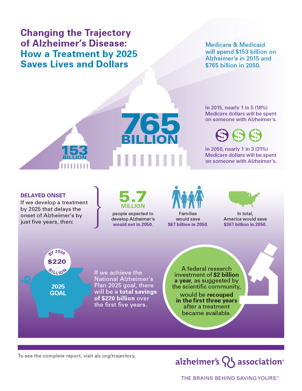 A full text of the Alzheimer’s Association Changing the Trajectory of Alzheimer’s Disease: How a Treatment by 2025 Saves Lives and Dollars can be viewed at www.alz.org/trajectory.