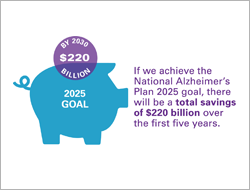 People living with Alzheimer’s and other dementias and their families would save $54 billion over the first five years in their out-of-pocket costs if the 2025 goal is met.