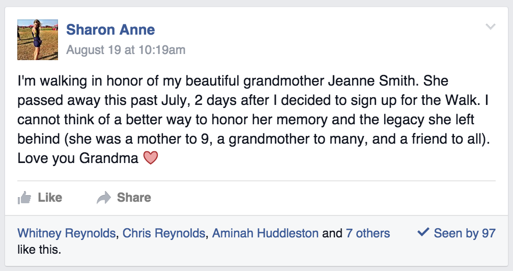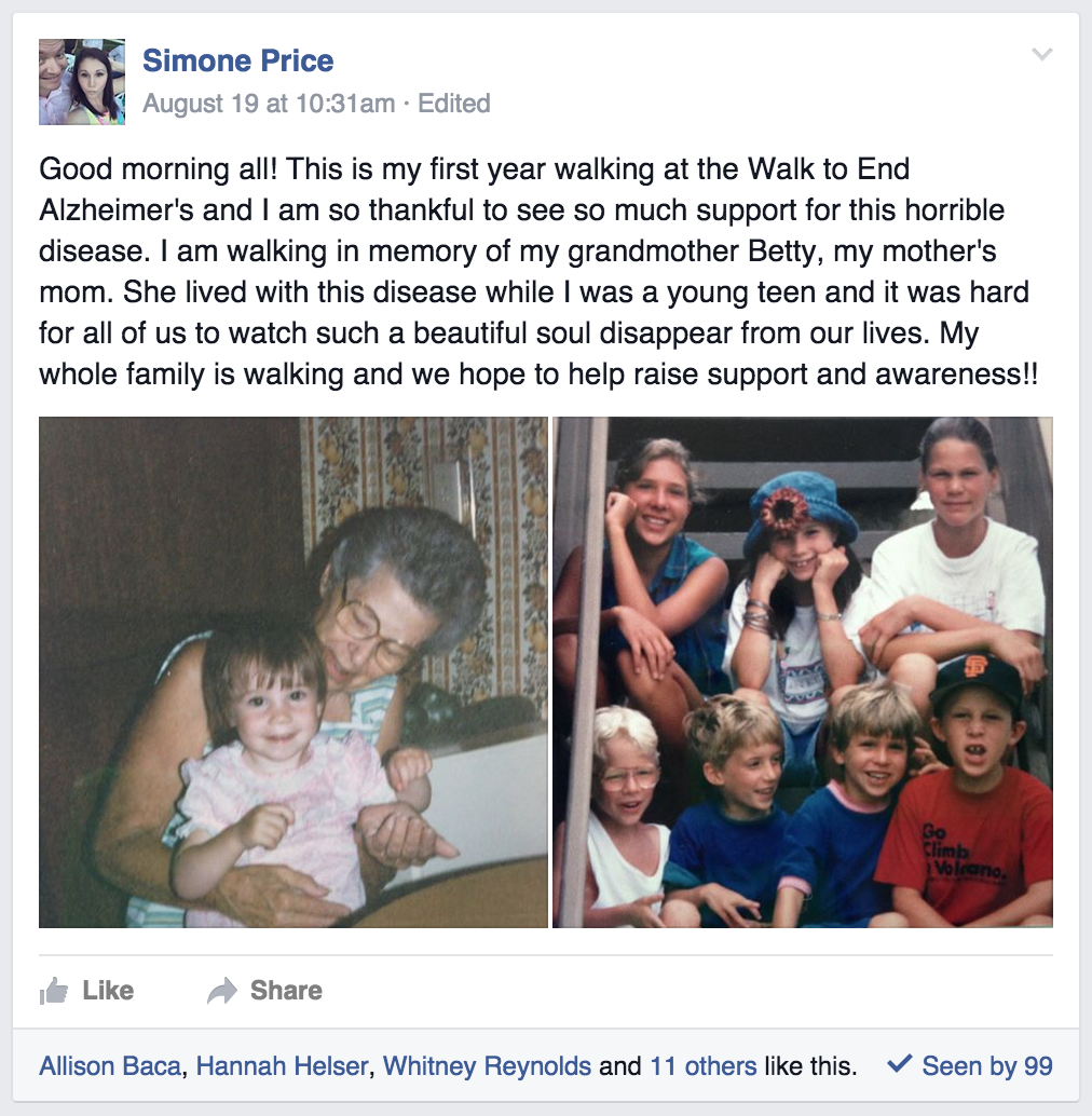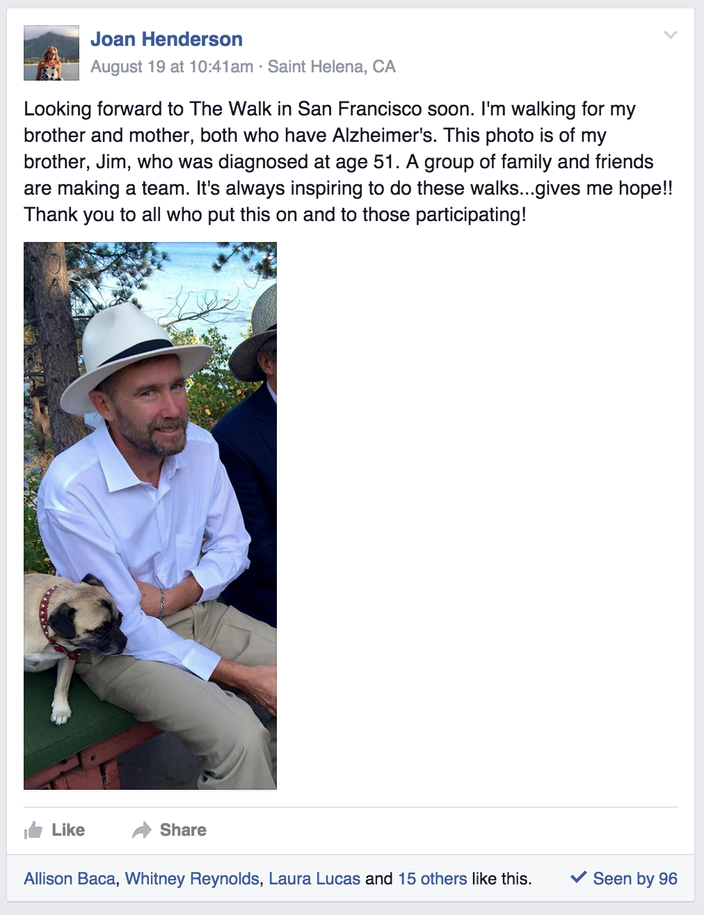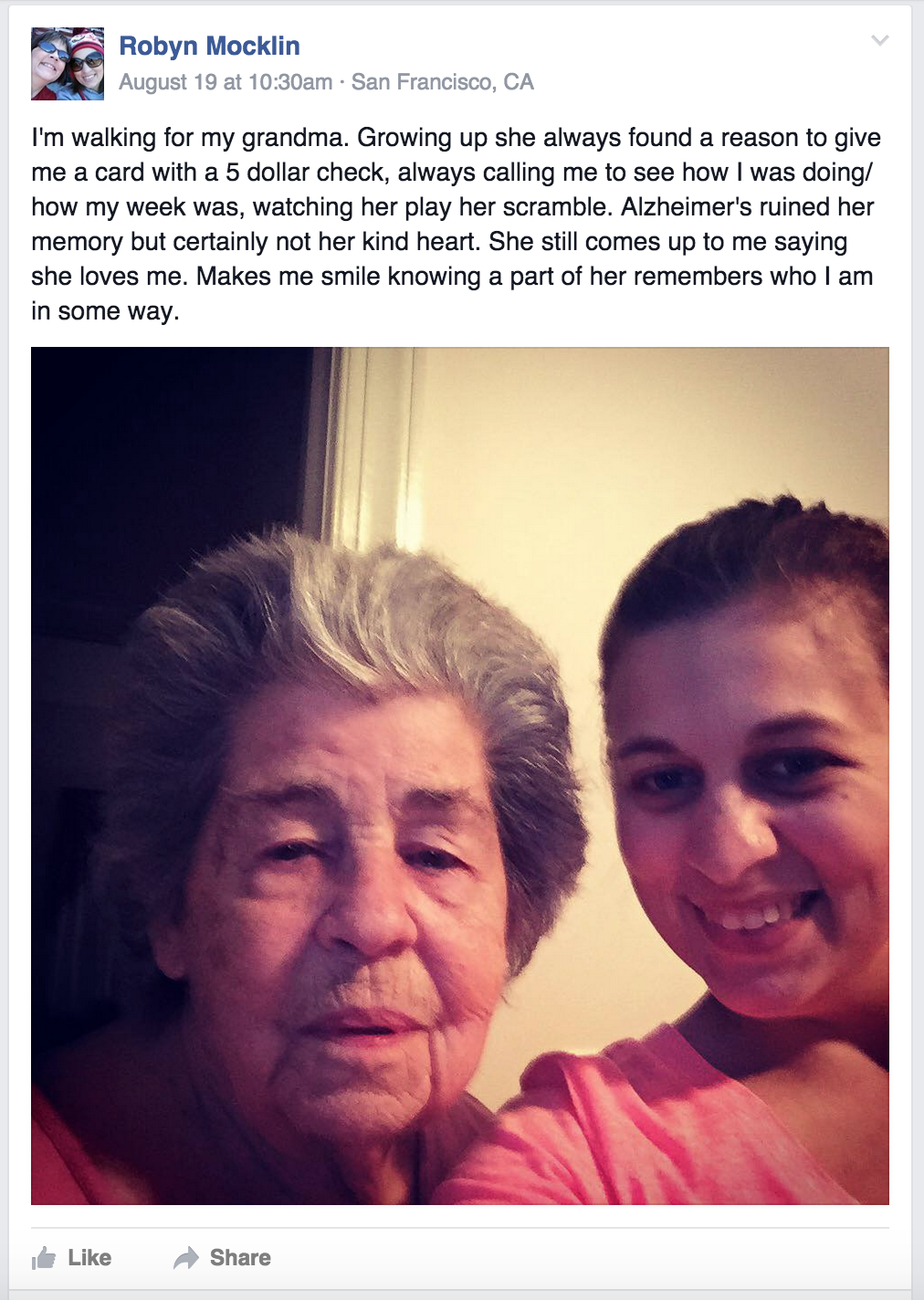 Such beautiful sentiments – thanks to all of the San Francisco walkers who shared their stories with us through Facebook. We hope the movement to #ENDALZ continues to grow and that we truly make a difference together! Join us at this years San Francisco walk or a walk in your area: www.alz.org/walk
