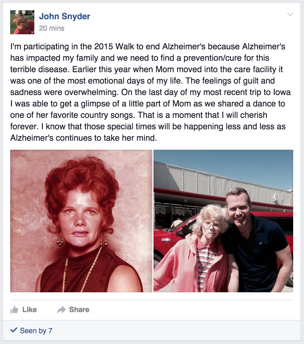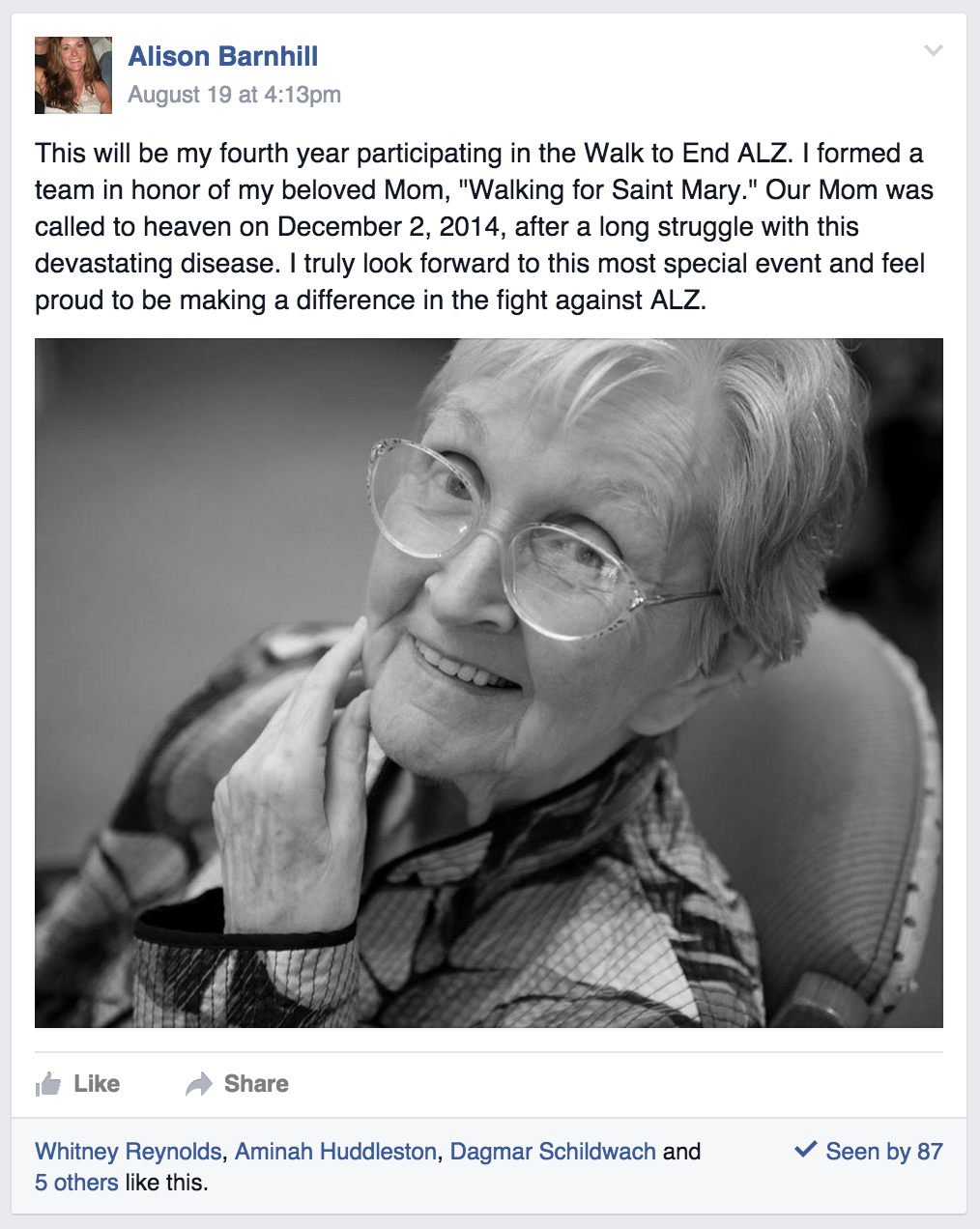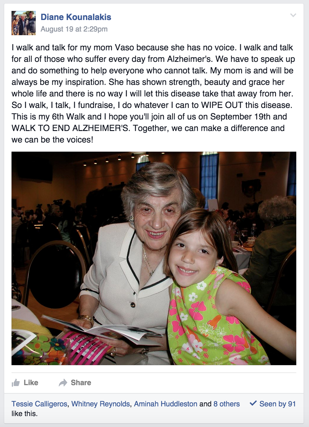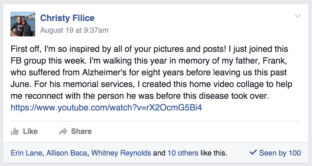 Such beautiful sentiments – thanks to all of the San Francisco walkers who shared their stories with us through Facebook. We hope the movement to #ENDALZ continues to grow and that we truly make a difference together! Join us at this years San Francisco walk or a walk in your area: www.alz.org/walk