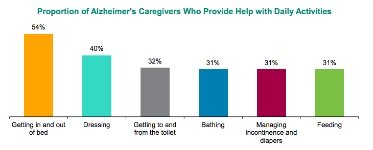 Over half of the caregivers of people with Alzheimer’s and other dementias provide help to the care recipient in getting in and out of bed; 40 percent help with getting dressed.
