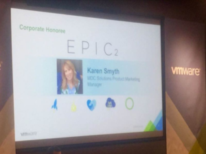 VMware gives awards each quarter to employees who have demonstrated their commitment to Execution, Passion, Integrity, Customers and Community (EPIC2). Recently, Karen was honored to receive the EPIC2 award from VMware, recognizing her community service to the Alzheimer’s Association. Karen’s supervisor nominated her for the award, which was announced at a staff meeting. They shared information on the numbers of Americans affected by Alzheimer’s and how Karen’s efforts were making a difference.
