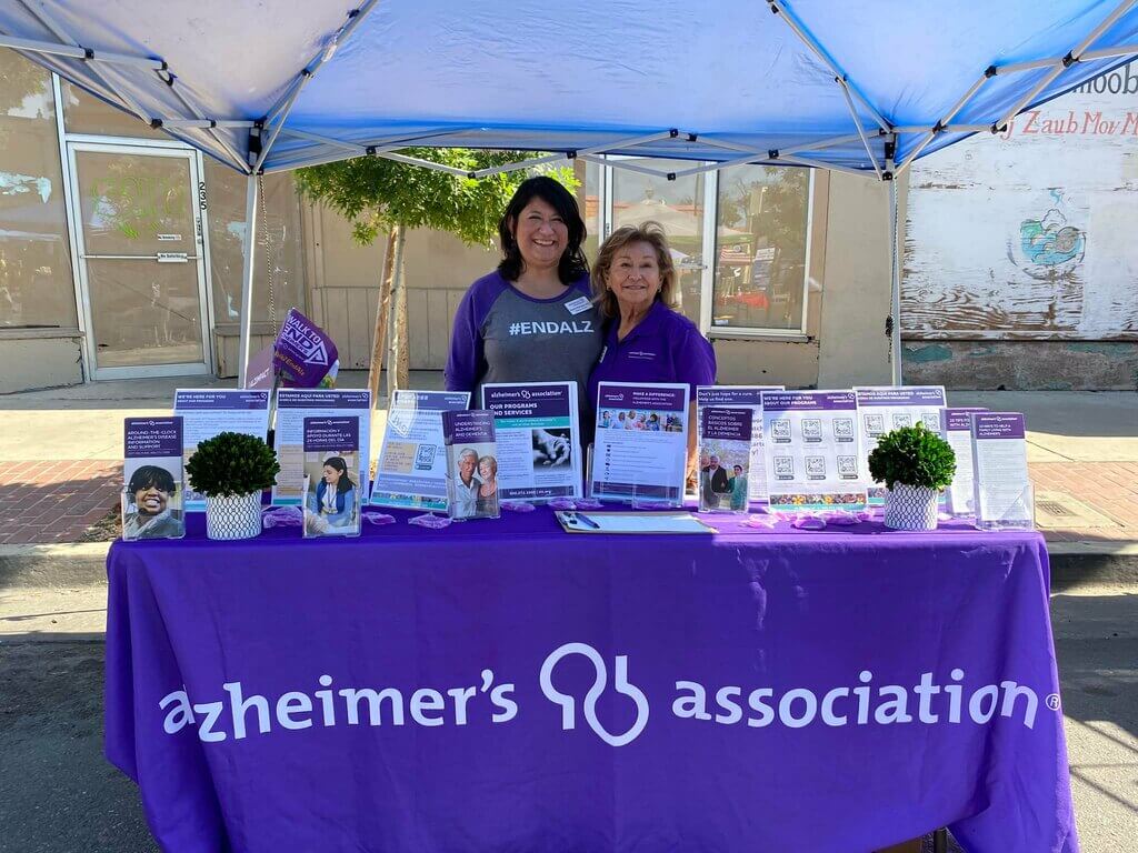 Hortencia and Alzheimer's Association staff member staffing resource table at community event