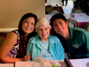 Audrey, her grandmother and her brother, Andrew, sitting at a table