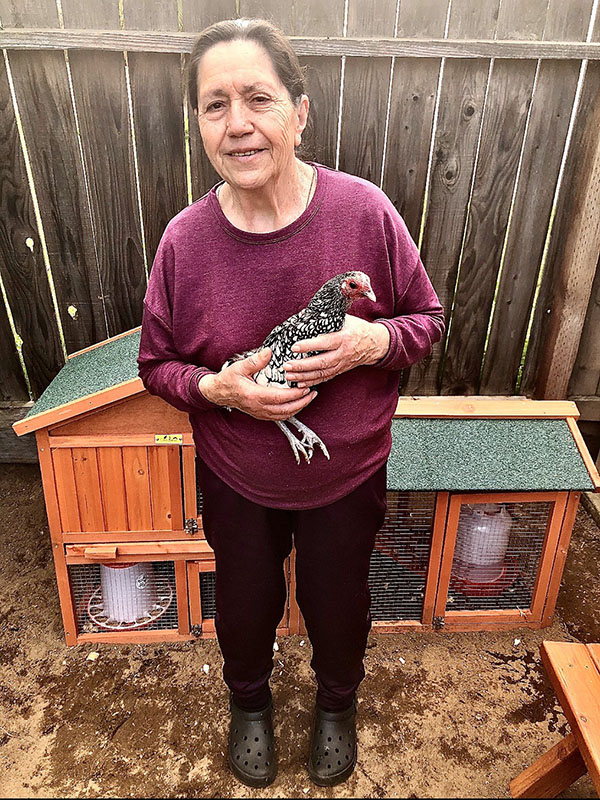 At first Felipe would remind her she didn’t have chickens but eventually asked himself, “What if I just got her chickens?” During the pandemic, Felipe, who is a middle school teacher, noticed on in one of his virtual classes that one of his students had chickens. He reached out to that child’s parents to learn more and eventually purchase some from them for his mom. Now, his mother happily goes out every night to feed her chickens.