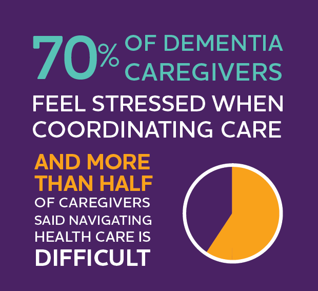 According to the Facts and Figures report 70% of caregivers, like Latrice, report that coordinating care is stressful. More than half of these caregivers said navigating health care is difficult and another 66% have difficulty finding resources and support for their needs. More than 1 in 3 caregivers report coordinating care with multiple doctors, securing appointments and getting help taking a break as leading stressors in navigating care for their recipient.
