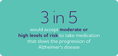 The report also states that nearly 3 in 5 Americans (58%) said they would accept a moderate or high level of risk with taking an anti-amyloid medication to slow the progression of Alzheimer’s disease, and nearly 1 in 4 Americans (22%) are willing to accept high risk.